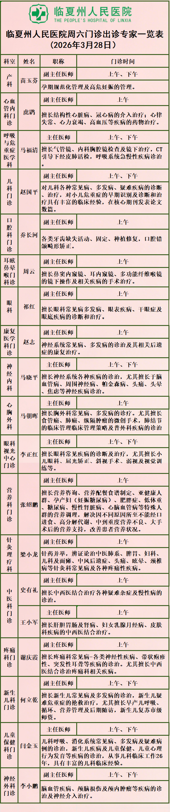 为深入践行“以患者为中心”的服务宗旨,切实推动“十个多一点”暖心行动走深走实,解决好上班族、学生看病时间冲突难调、专家号难寻的问题,进一步优化医疗服务,改善就医体验,满足患者多元化的就医需求,州人民医院周六门诊继续为您服务!