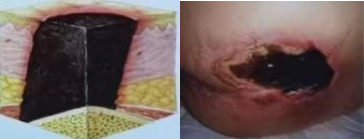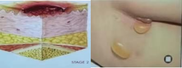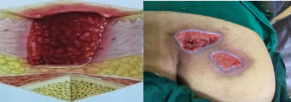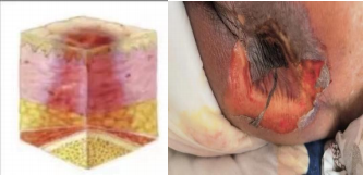 全层皮肤组织缺损,可见皮下脂肪,常伴有肉芽组织和伤口边缘内卷、伴有潜行和窦道。此期压疮的深度随解剖部位的不同表现,肥胖者可发展为较深的伤口。不伴有筋膜、肌肉肌腱韧带或骨的暴露。