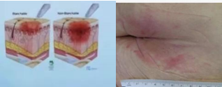 皮肤完整,无破损,指压不变白,若以指压红斑印移开时,红斑印不会消退。皮肤完整,局部有指压不变白的红斑,但在深色人种会有所不同。先前可表现为局部指压变白的红斑或知觉、温度、硬度的变化。这里的颜色改变不包括皮肤变为紫色、褐色、如有这种变化提示有深部组织损伤。