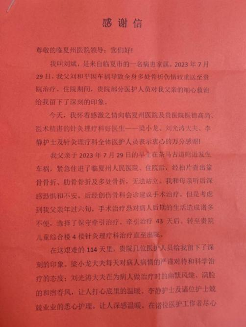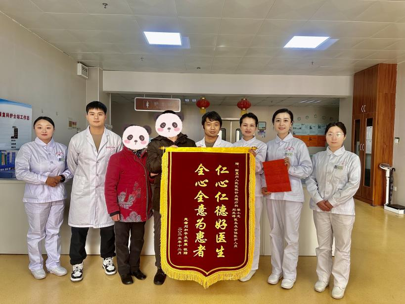 如信中所言,患者于2023年7月29日不幸发生车祸到我院治疗,经创伤骨科住院治疗好转后,转入针灸理疗科进一步康复治疗。针灸理疗科初诊时患者不能弯腰转身,右下肢肌肉轻度萎缩且疼痛不止,不能站立行走,活动非常受限。科室医护人员经详细探讨后,制定一系列治疗、护理方案,决定采用针药并举、中西医并用的方式展开康复治疗。医护人员通力合作,指导患者进行循序渐进的肢体功能训练,经60多天的系统治疗,患者康复效果日益明显,从辅助翻身到自主翻身,再到坐位→站立→助行器辅助下行走→家属搀扶行走→独立行走逐步过渡,至出院时,患者已可以独立站立并进行短距离独立行走,随着病情的逐渐好转,患者的心情也越来越好。“金杯银杯不如患者的口碑”,在出院1月后,收到患者及家属专程送来的锦旗及感谢信时,让医护人员在数九寒天的冬季内心涌上一股暖流,一声“谢谢”表达了他们对医护人员工作的肯定。