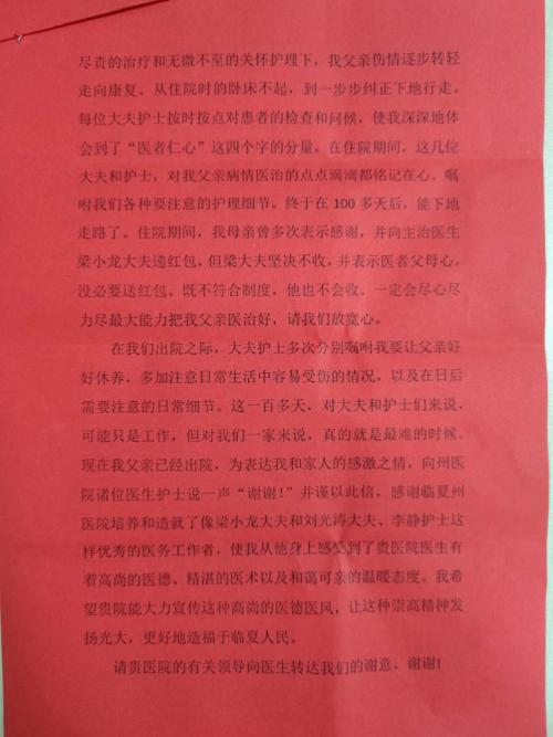 正值冬至,阴阳转换,天地交替入九之际,州人民医院针灸理疗科收到了一份特殊的“礼物”,已经出院1个月的患者刘某及家属为科室医护人员送来一面锦旗及一封感谢信,表达对州人民医院针灸理疗科医护人员在其住院期间精心诊治、暖心护理的感激之情。