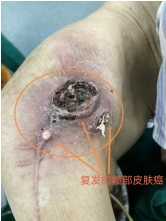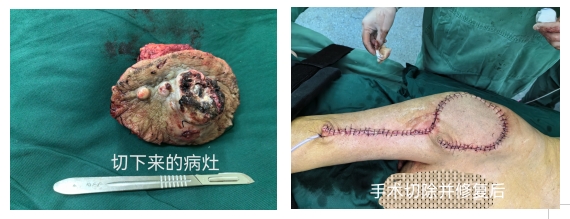 91岁的马爷爷7年前偶然发现右侧髋部上出现一个黄豆大小的小疙瘩,小疙瘩越长越大,并逐渐出现溃烂、瘙痒等症状。马爷爷就诊当地医院行手术切除,数月后疙瘩再次复发,又进行了手术切除,但二次手术后切口愈合不好,原来的“疙瘩”又叒叕很快长大,并出现伤口溃烂、流血流脓,甚至因疼痛无法走路,非常痛苦。加之马爷爷九十几岁的高龄,又有很多内科疾病(心肺功能差,稍活动心累气短),当地医院无法治疗。
