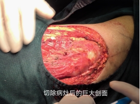 肿瘤外科团队会同内科、麻醉科、营养科等有关学科开展MDT(多学科讨论)共同研究制定治疗方案,最终决定由麻醉科主治医师王小冬采取腰麻+髂筋膜+股神经阻滞麻醉方案,这种麻醉方式相比单纯腰麻,不仅止疼效果好、麻醉时间长,而且比全麻风险要低。良好的麻醉下,手术在肿瘤外科特聘专家梁鹏主任指导下顺利进行:彻底切除肿瘤时发现,肿瘤已经深部侵犯达骨筋膜,巨大的创面需要修复,团队精心设计、切取皮瓣移植到创面,完美修复。术后病理回报病灶周切缘干净……术后团队精心护理,及时处理创面渗液,移植皮瓣顺利存活,创面愈合,目前已拆线康复出院。