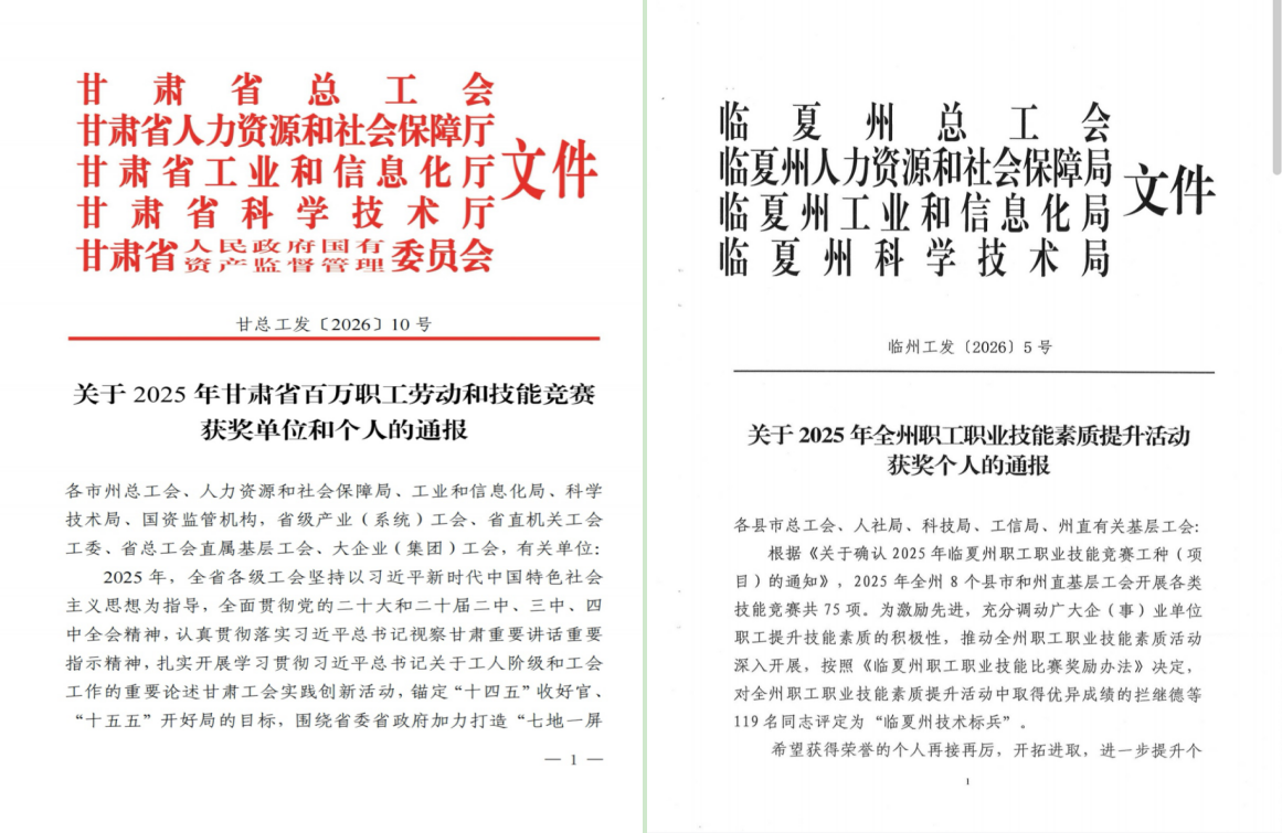近日,甘肃省总工会、甘肃省人力资源和社会保障厅、甘肃省工业和信息化厅、甘肃省科学技术厅、甘肃省人民政府国有资产监督管理委员会联合发布了《关于2025年甘肃省百万职工劳动和技能竞赛获奖单位和个人的通报》,我院12名医务人员荣获“甘肃省技术标兵”称号;临夏州总工会、临夏州人力资源和社会保障局、临夏州省工业和信息化局、临夏州科学技术局联合发布了《关于2025年全州职工职业技能素质提升活动获奖个人的通报》,我院3名医务人员荣获“临夏州标兵”称号,充分展现了州医院人才队伍的专业素养与时代风采,为医院高质量发展再添荣光。
