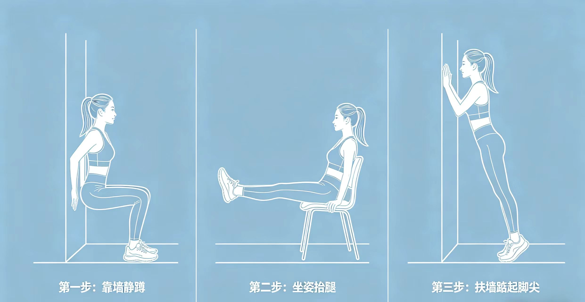 1.靠墙静蹲(练大腿):背靠墙,双脚分开与肩同宽,慢慢下蹲到大腿平行地面,保持30秒-1分钟,休息30秒,做3组。