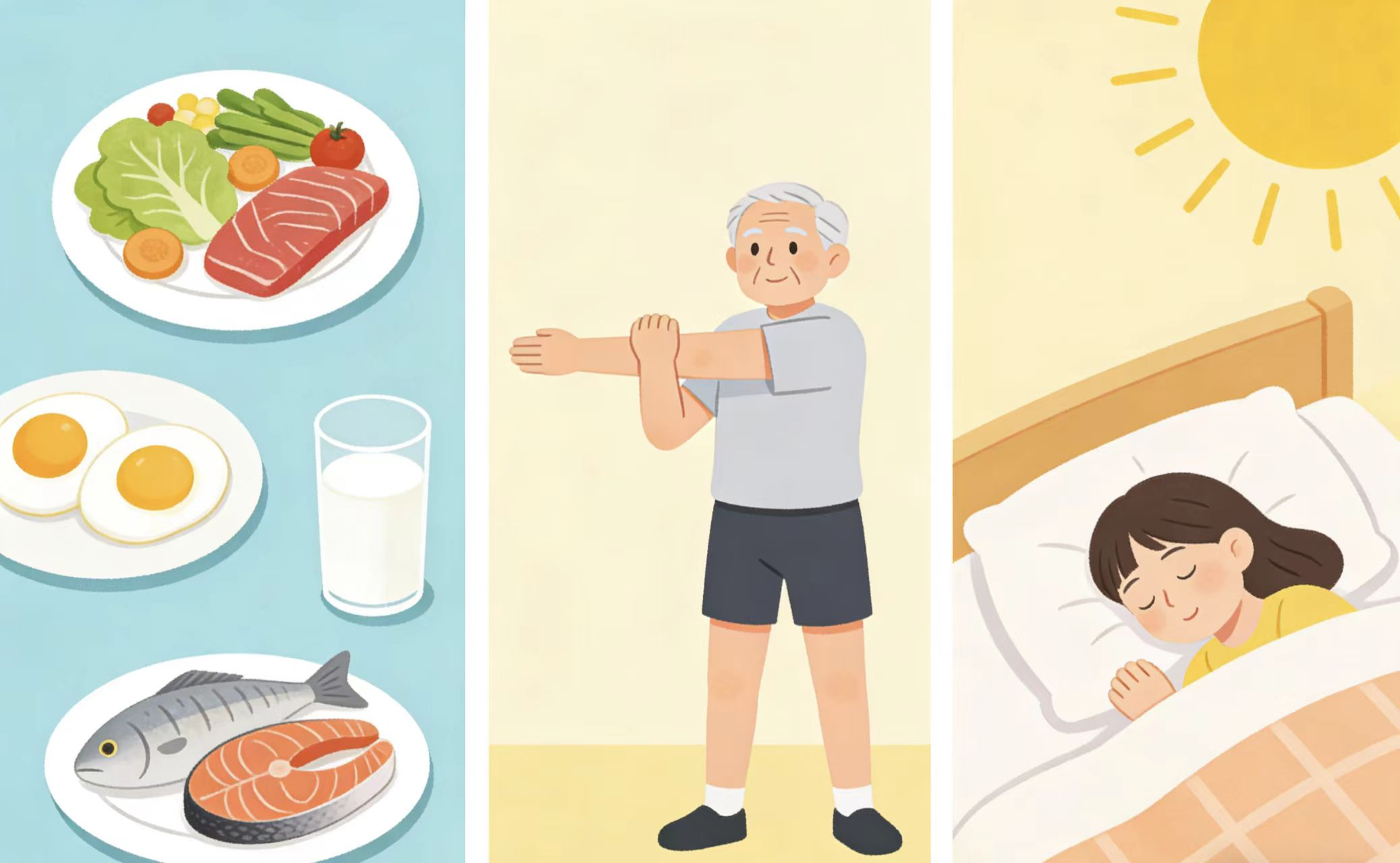 补充维生素D:多晒太阳(每天15分钟),或吃深海鱼、蛋黄。